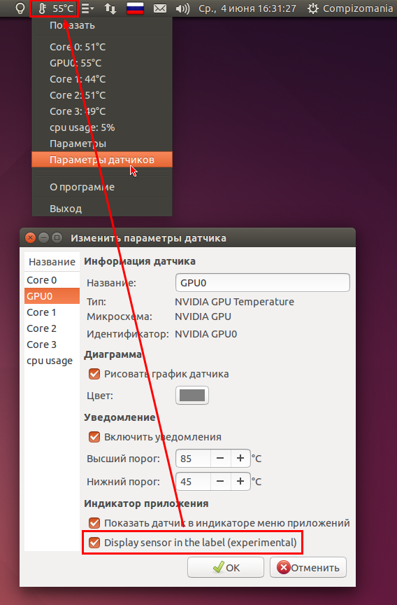Psensor является индикатором для мониторинга аппаратных датчиков температуры с опцией отображения температуры рядом с индикатором.