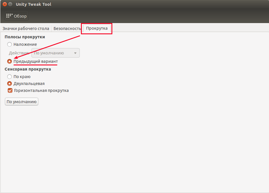 Сделать это можно в установленном приложении Unity Tweak Tool – Система – Прокрутка активируйте параметр Предыдущий вариант:
